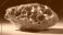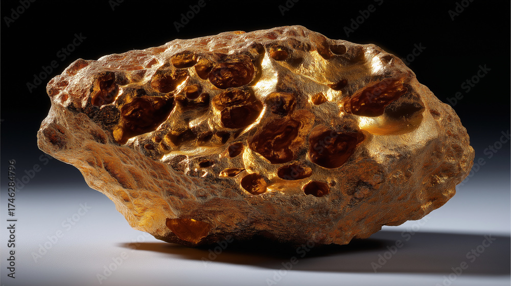 • Detailaufnahme eines rauen goldenen Meteoriten mit poröser Oberflächenstruktur vor dunklem Hintergrund