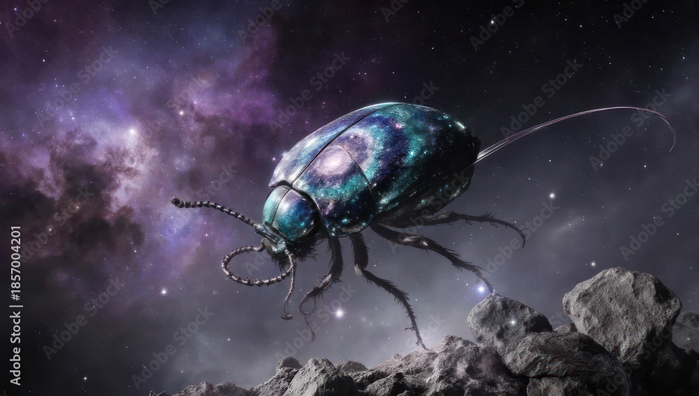 • Alien Beetle Crawling On Asteroids In Deep Space Nebula.