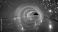 • Kosmischer Tunnel mit leuchtenden Partikeln und violettem Nebel führt ins Universum
