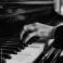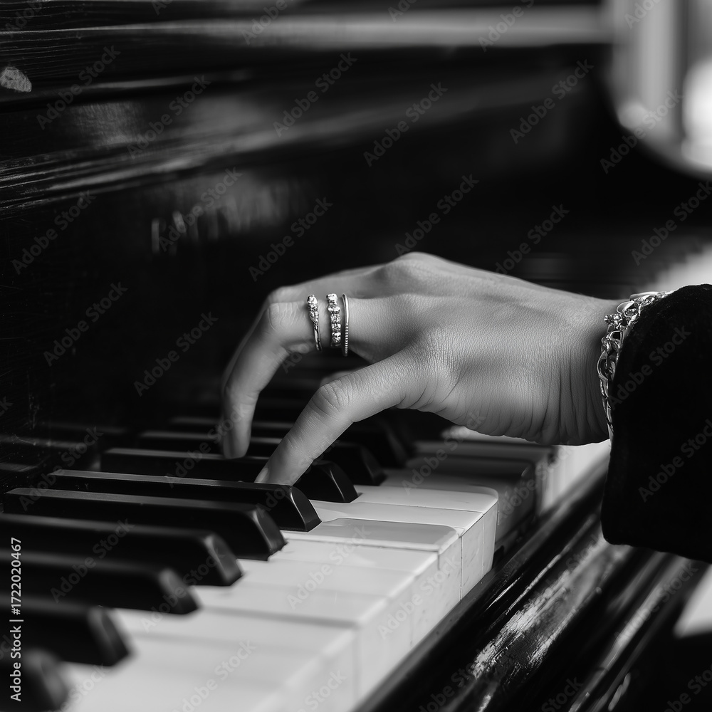 • Czarno-białe zbliżenie dłoni pianistki grającej na fortepianie. Podkreśla delikatność i precyzję muzycznych gestów.