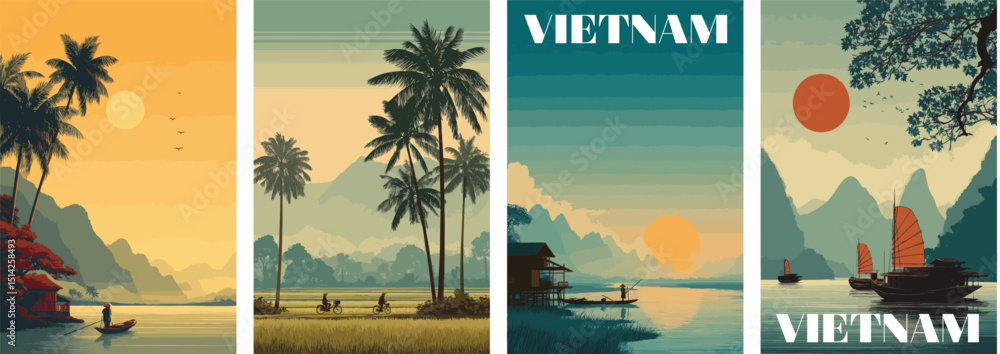 • Vietnam vintage style travel poster set. Collection of scenic art deco retro tourism illustrations