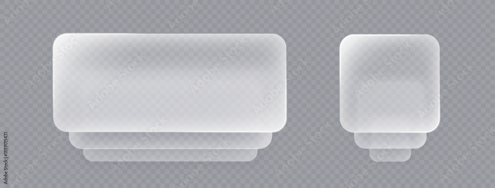 • Liquid glass push button on transparent, 3d light frame banner set, glass panel for mobile and web app, tech board frame in futuristic style. Light banner stack with glow effect, vector illustration.