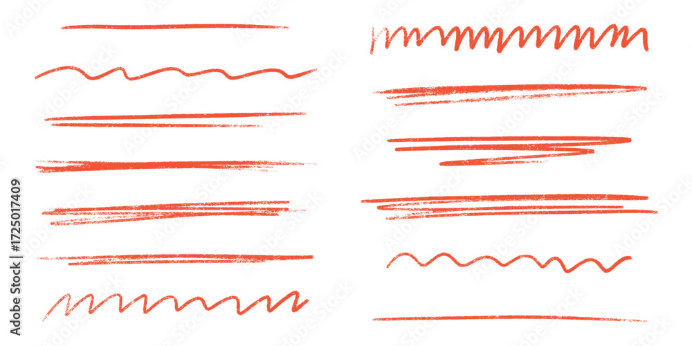 • Red line brush stroke with pencil underline and crayon textures for graphic design - wavy marks, straight elements and zigzag patterns. Hand drawn highlights with rough edges for text decoration.