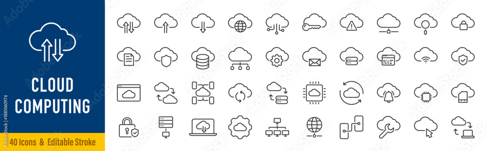 • Cloud computing web icons in line style. Cloud technology, data center, connection network, digital service, database platform, collection. Editable stroke. Vector illustration.