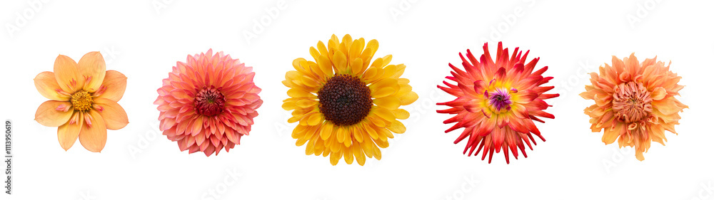 • A collection of real autumn yellow, orange and red dahlia flower heads isolated against a transparent background for design elements.