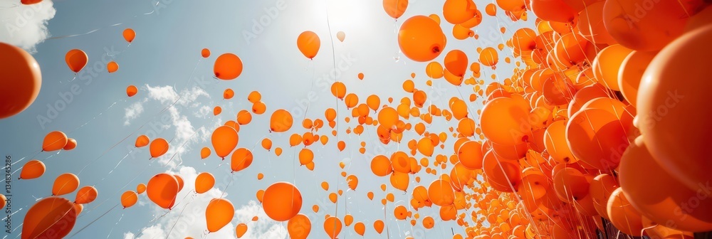 • Celebration of koningsdag with vibrant orange balloons in the netherlands sky. King's Day. Horizontal banner. Copy space