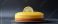 • A glossy yellow lemon cake topped with a lemon slice on a black background in a studio shot.