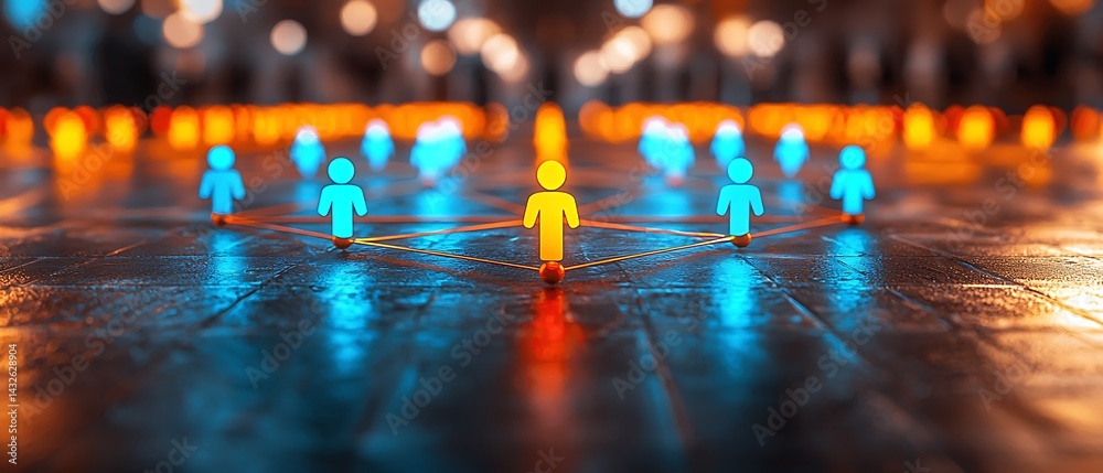 • Depicts interconnected figures in network, bathed in blue and orange light