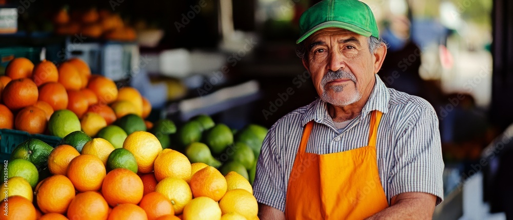 • An elderly vendor in a green cap and orange apron stands proudly next to piles of fresh oranges and limes at an open market.