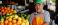 Panel Szklany do Kuchni - An elderly vendor in a green cap and orange apron stands proudly next to piles of fresh oranges... #1492639462