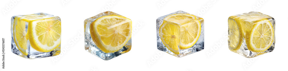 • Isolated lemon slice encased inside an ice cube, offering a refreshing and vibrant visual element ideal for summery themes, presented as a PNG set with a transparent background