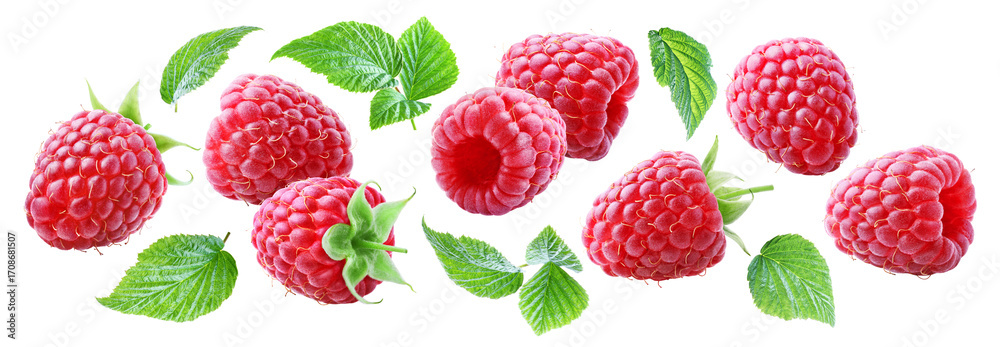 • Set of juicy flying raspberries with leaves isolated on transparent background.