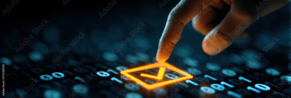 Panel Szklany do Kuchni - A hand hovers over an orange checkmark in a box against a blue binary code backdrop, symbolizing... #1752382510