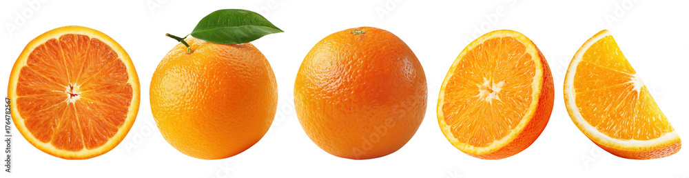 • Set isolated fresh fruit, orange in various style, on transparent background.