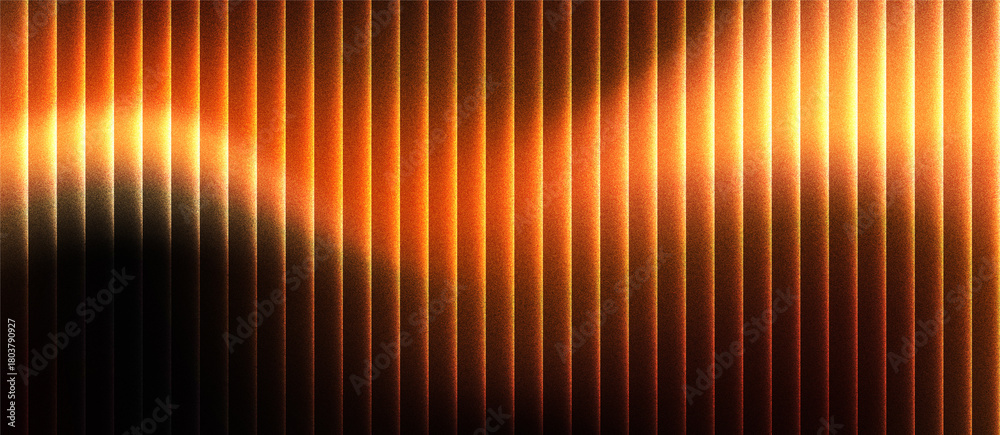 • Abstract grainy ribbed glass background in golden orange tones with glossy curved texture, vertical light lines and smooth gradient for use in luxury design or digital surface visuals