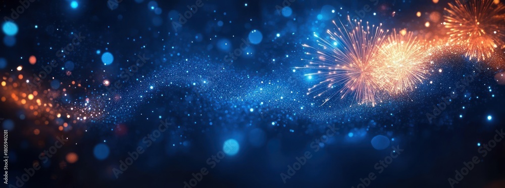 • blue sparkling bokeh background with golden orange fireworks bursts and a glittering particle wave conveying a festive magical celebratory mood