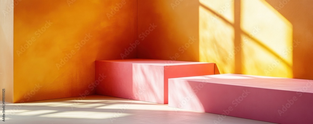 Panel Szklany do Kuchni - Sunlit minimalist room with geometric pink and orange shapes #1811555525