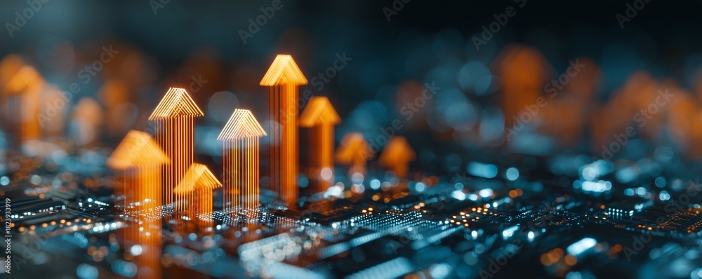• Glowing orange arrows pointing upward on a blurry circuit board background, concept for data analysis, business growth and technological advancement