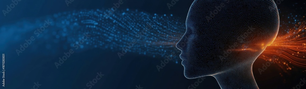 • Contemplative digital human profile made of glowing dots with blue particle stream entering and orange data flow exiting, conveying futuristic introspection and connection
