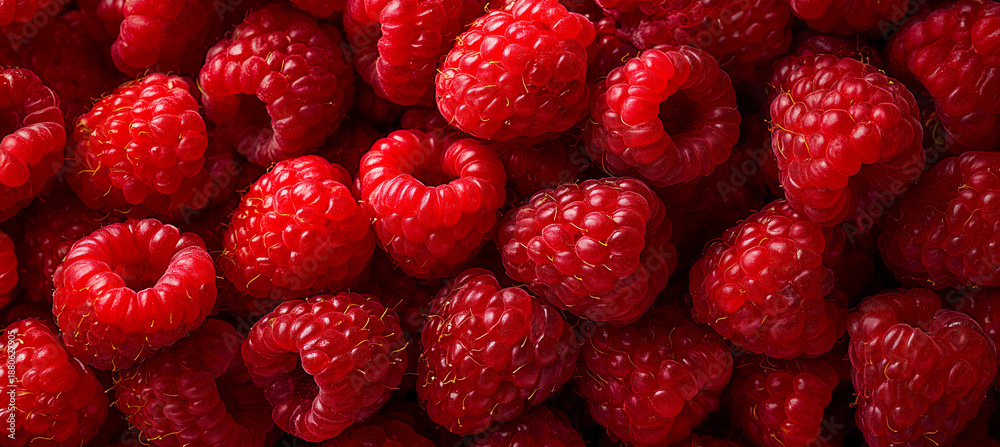 • Fresh ripe raspberries forming a vibrant red natural texture background.