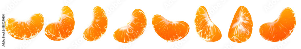 • Set of peeled, fresh tangerine or mandarin orange segments falling down. Isolated on transparent background, png