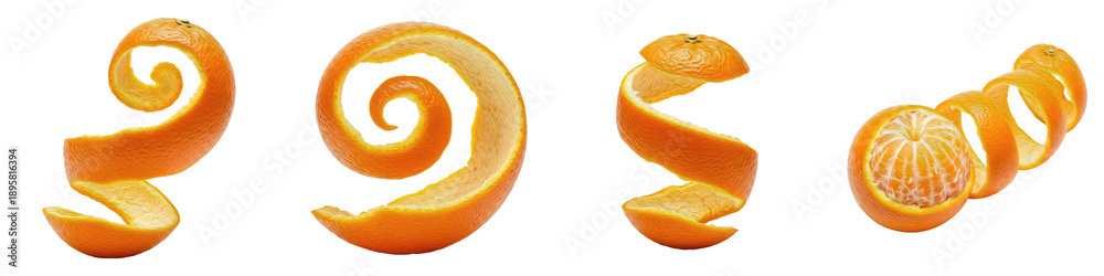 • Set of orange fruit peels in spiral shapes, creative citrus zest curls and twisted orange skin isolated on white background.