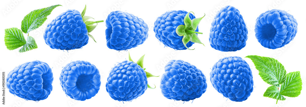 • Set of juicy ripe blue raspberries with leaves isolated on transparent background.
