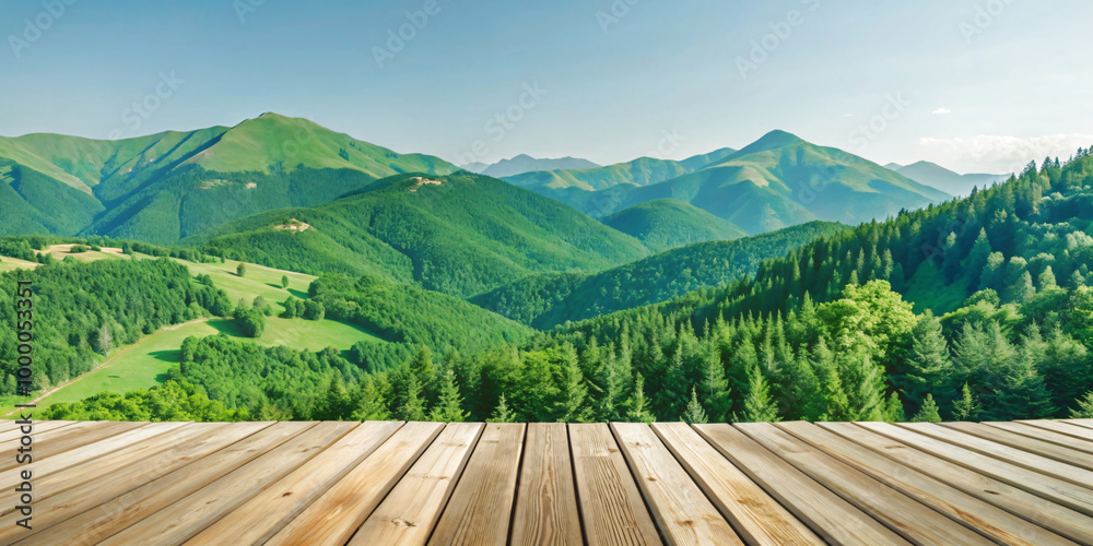 • Wooden floor, natural mountain background with landscape of mountains and wildlife. Rustic empty wooden for product