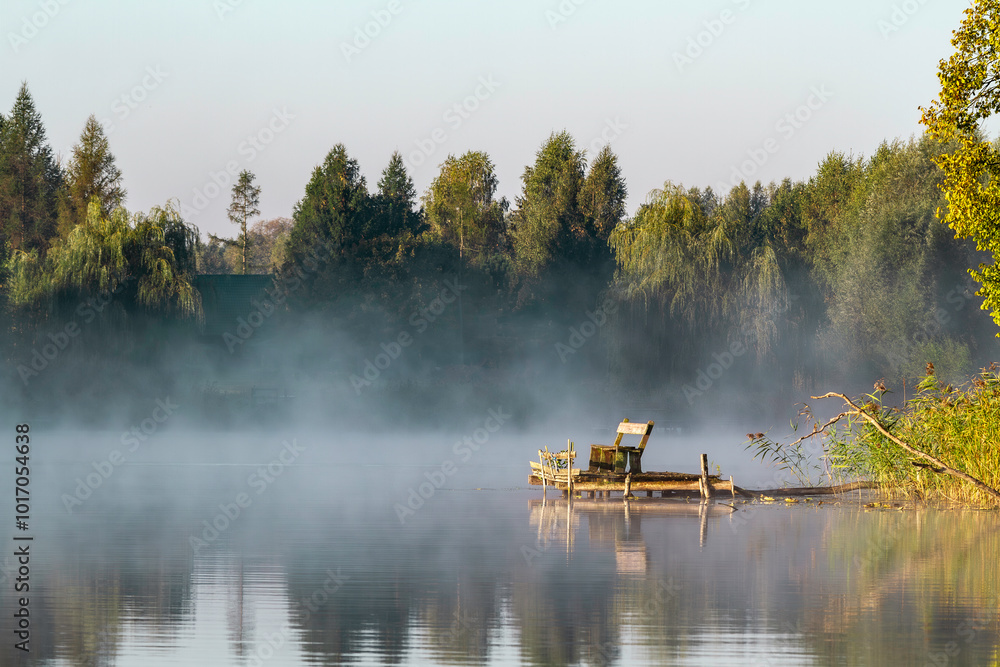 • beautiful view of a lake in the fog, a wooden pier and a wonderful, peaceful forest, for wallpaper or poster
