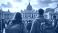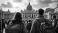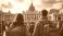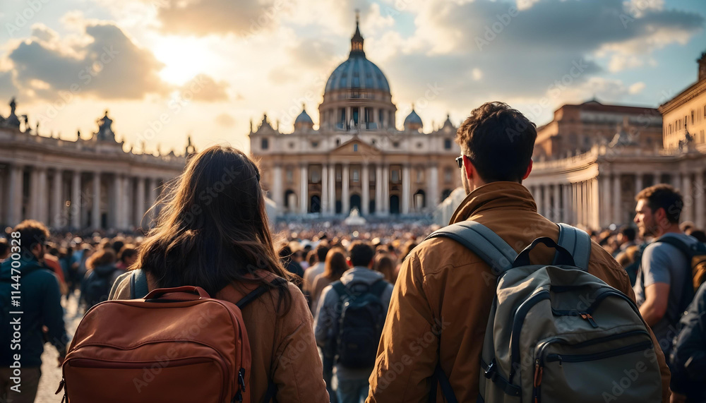 • Chicos jóvenes llegando a Roma en el año jubileo. Basílica y plaza de San Pedro. Día alegre y soleado.
