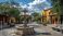 • Charming cobblestone street with fountain and colorful colonial houses under a sunny sky