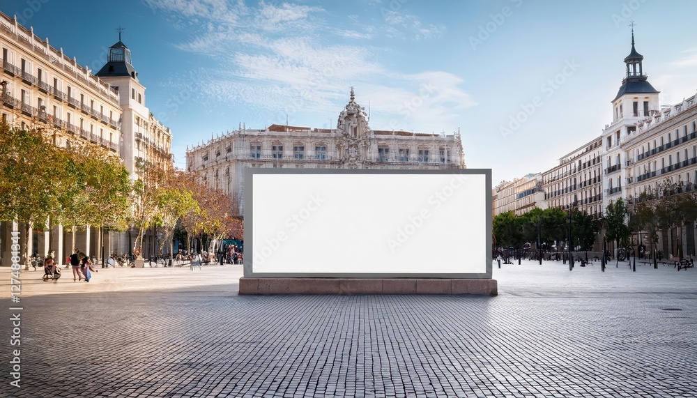 • Vibrant Urban Square Empty Billboard Canvas Awaiting Artistic Expression Amidst Historic Madrid Architecture, Bathed in Natural Light and Buzzing with Energy.
