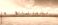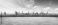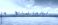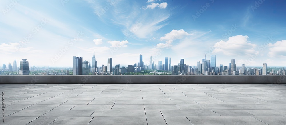 • Panoramic city skyline view with modern buildings under a bright blue sky, open concrete plaza in foreground with ample copy space on stone tiles.