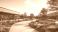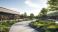 • Modern shopping center with lush landscaping and walkable pathways under a clear blue sky.