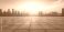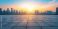 • Empty concrete plaza with modern city skyline in the background at sunset