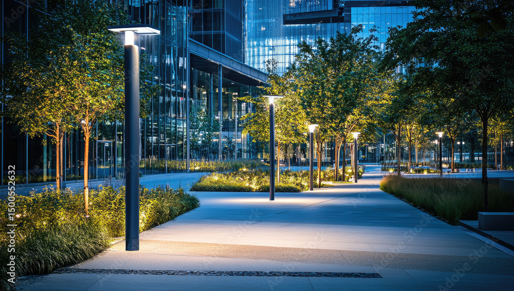 • A modern cityscape at twilight, featuring a well-lit plaza with slender lampposts lining a paved pathway amidst lush green landscaping and towering glass buildings