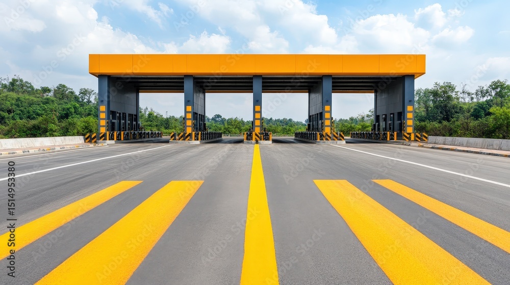 Panel Szklany do Łazienki - Empty toll plaza on a highway with bright yellow road markings under a partly cloudy sky. #1514953380