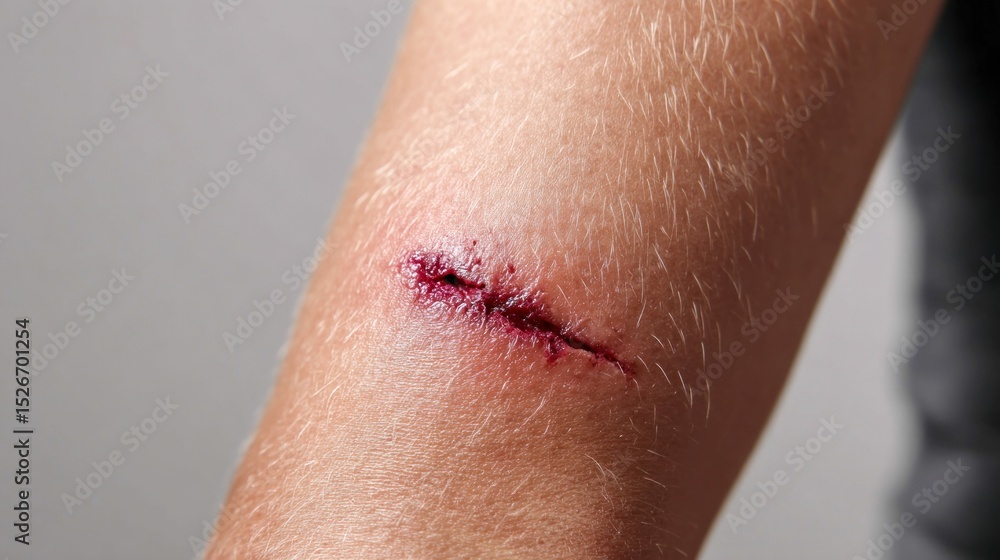 • Close-up of a fresh, deep, and bloody wound on human skin, with visible tissue. The injury is raw and indicates a recent trauma.