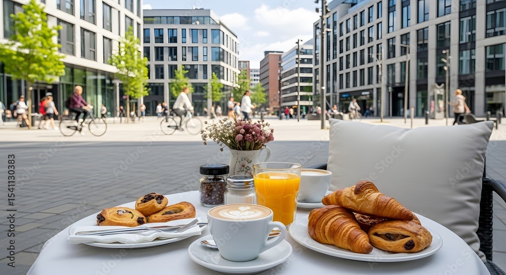 • Outdoor coffee table in a lively city square with cappuccino, croissants, orange juice, and small pastries, surrounded by modern buildings and people walking