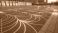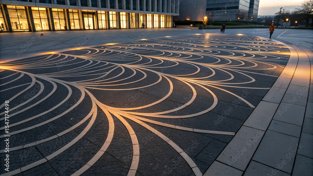 • Modern urban plaza paving with illuminated abstract pattern at dusk