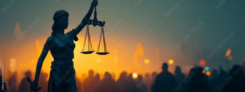 • Bronze Lady Justice statue with balanced scales in city square, morning light, International Justice Day