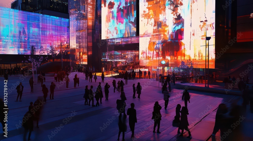• Vibrant Cityscape at Night with People Silhouettes and Digital Art Facades