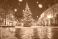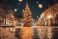 • A festive street scene at night with a large Christmas tree wrapped in golden lights and red ornaments, standing at the center of a cobbled town square.