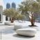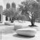 • Outdoor plaza with smooth, pebble-shaped benches, lush trees, and modern architecture