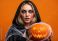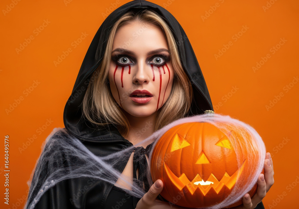 • Young woman in witch costume with bloody tears makeup holding a jackolantern pumpkin