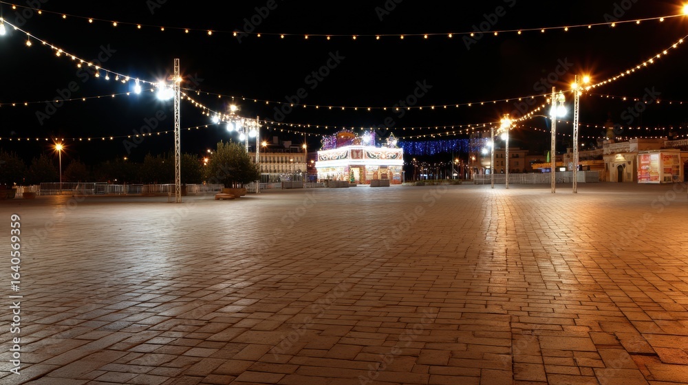 • Beautifully illuminated carnival entrance gate stands at night, adorned with festive lights, creating vibrant atmosphere. empty plaza showcases cobblestone pavement, enhancing enchanting scene