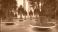 Panel Szklany do Łazienki - City park with modern benches and trees illuminated at night with buildings #1642949653