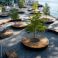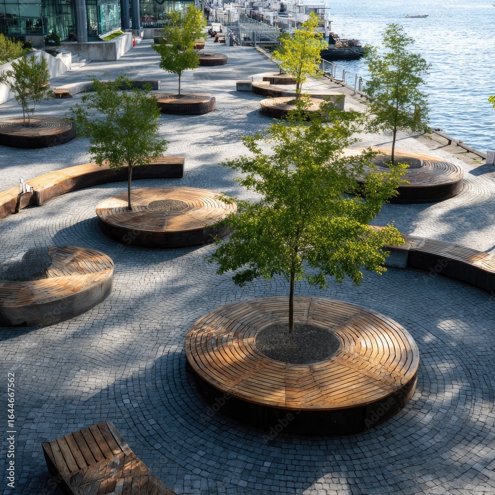 • Sun-dappled waterfront plaza with circular benches surrounding young trees, paved with grey stone, offering tranquil seating near water