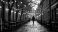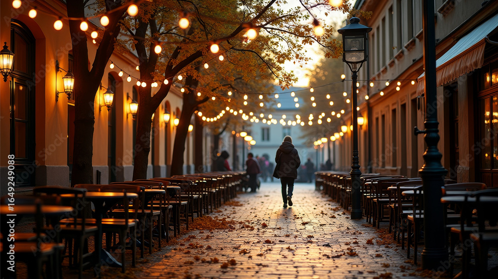 • Charming old town square in autumn evening with string lights and golden leaves on wet cobblestones