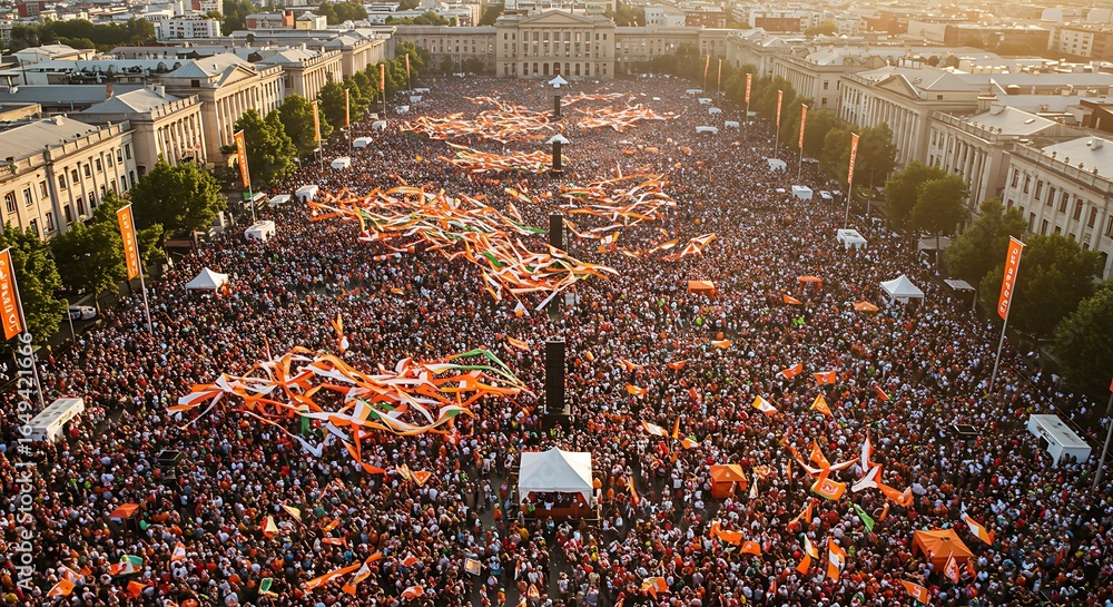 • Large crowd fills a city square, waving orange banners during a political rally.